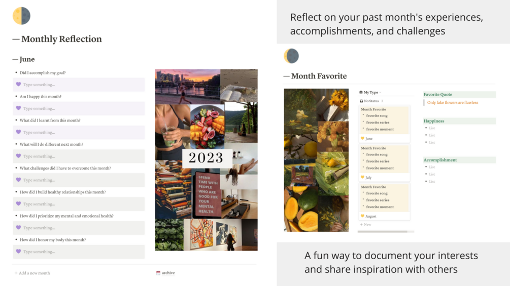 - Monthly Favorites: A fun way to document your interests and share inspiration with others.