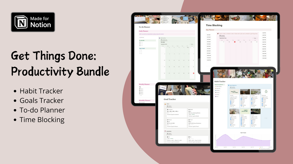 3. Get Things Done- Productivity Bundle: A comprehensive package with habit tracker, goals planner, to-do planner and time blocking template to revolutionise the way you work and achieve your goals and help you stay organised, focused, and on track.