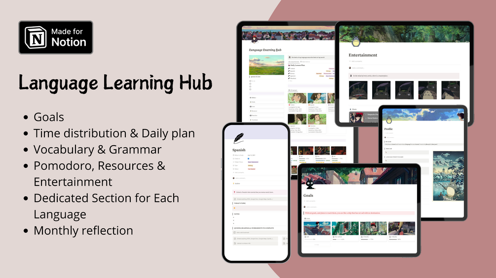 2. Language Learning Hub: Master a new language effortlessly- Set goals, track study time, and create daily plans for vocabulary, grammar, and conversation. Use flashcards, Pomodoro Technique, and organize resources. Enjoy language learning through entertainment and dedicated sections for each language. Reflect monthly and stay motivated.